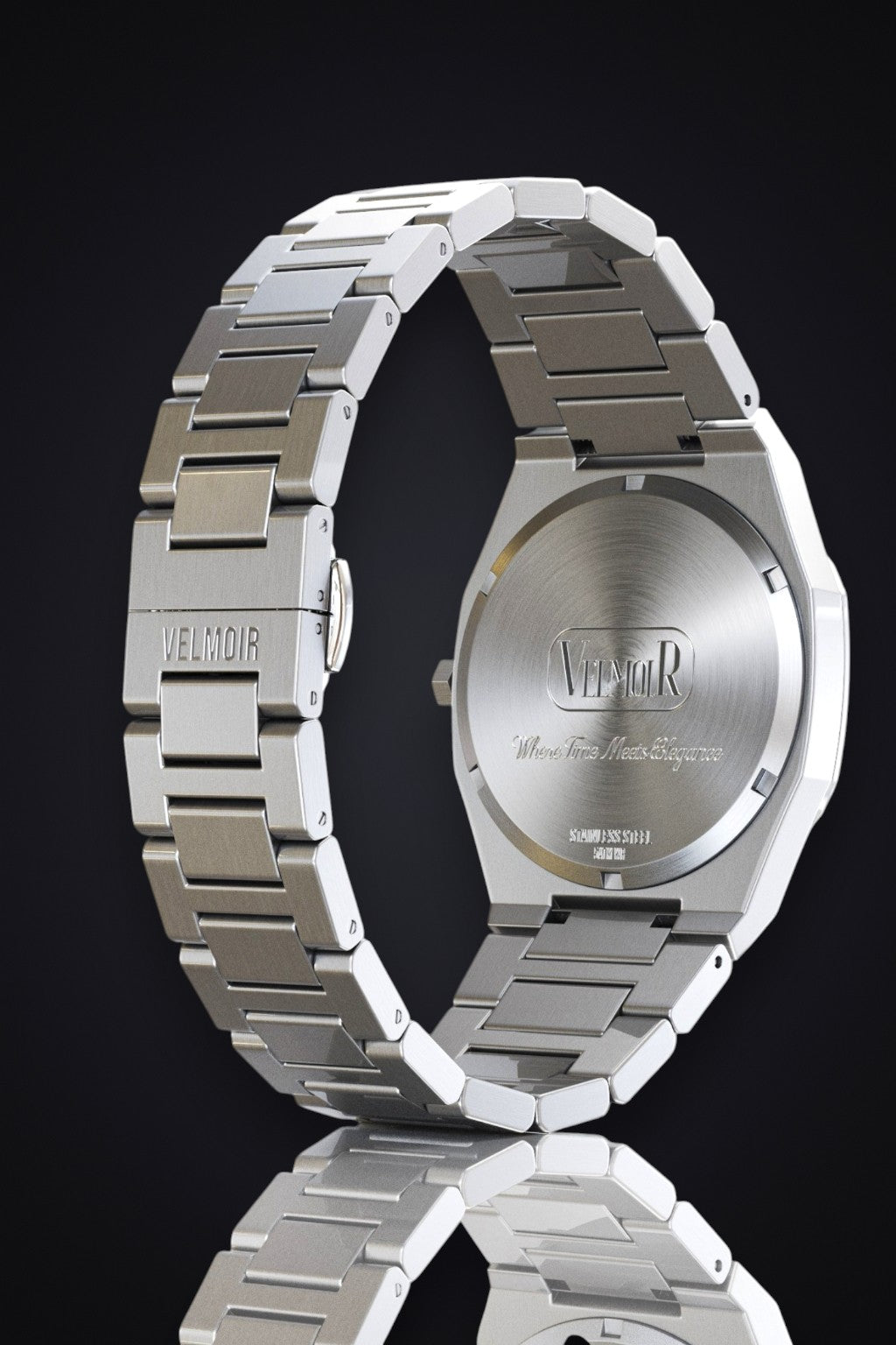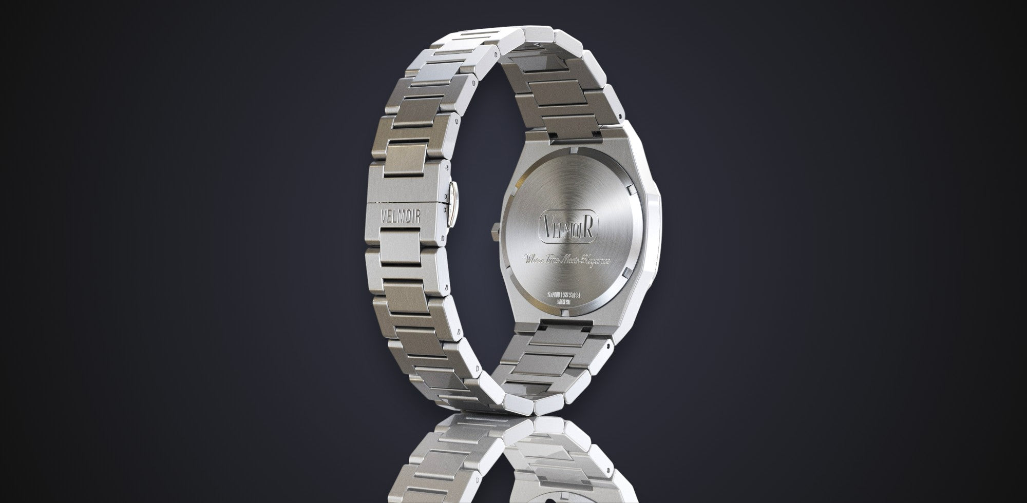 Auf der Rückseite und dem Verschluss ist eine Gravur eingearbeitet, die jede Velmoir-Uhr zu einem besonderen Begleiter macht – stilvoll im Business, robust im Alltag.