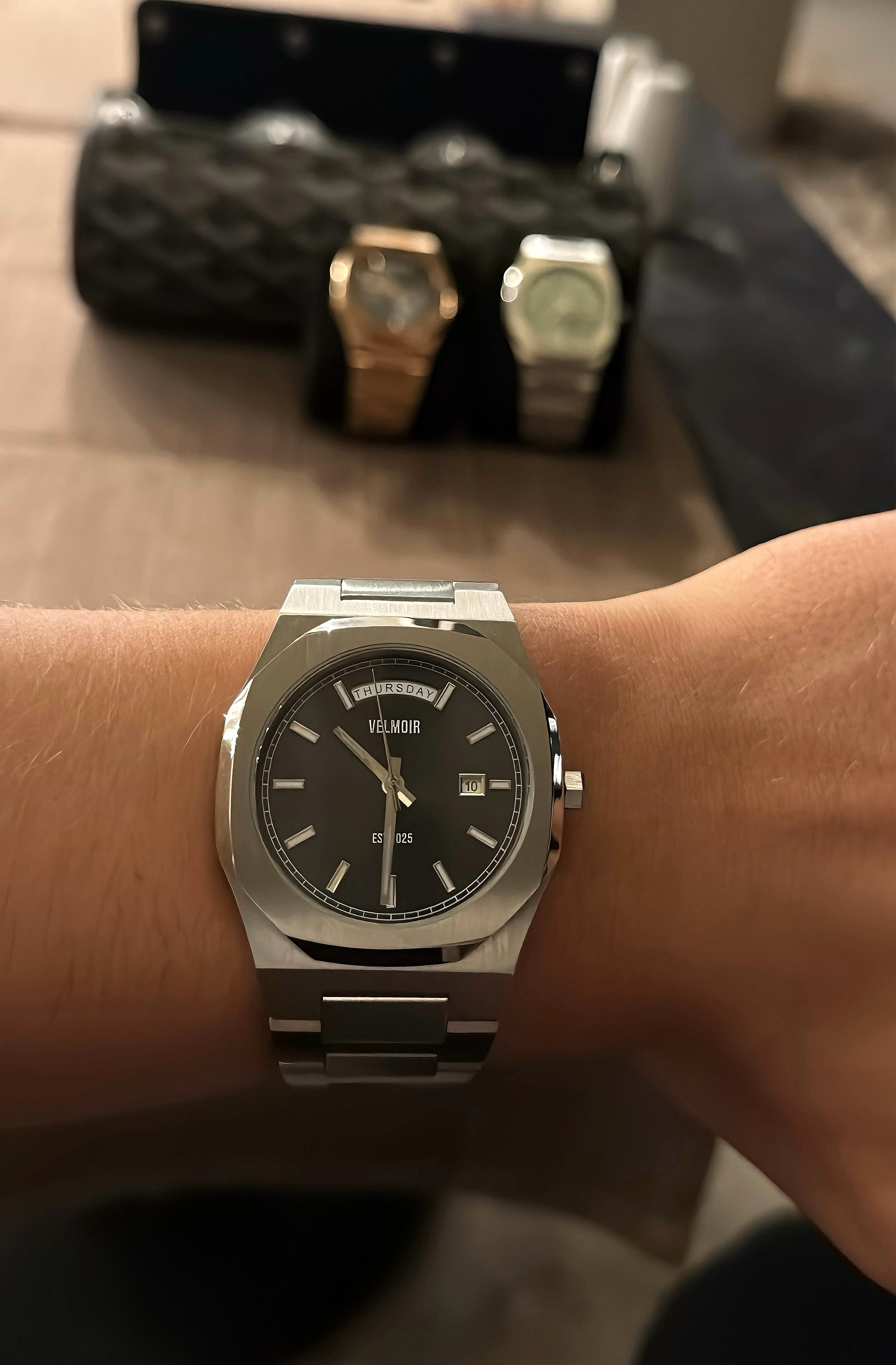 Die Velmoir Nero ist der perfekte Begleiter für jeden Anlass. Funktional durch die Day-Date Funktion und zeitlos dank ihres ikonischen Designs. Dank unseres Quartz Movements läuft die Uhr dauerhaft und zuverlässig. Das 316L Edelstahl-Gehäuse garantiert Robustheit im Alltag und Eleganz im Business. Mit bis zu 50m Water Resistance bleibt die Uhr im Kontakt mit Wasser zuverlässig. Designed in Germany und mit dem markanten Lumina Effekt ausgestattet, begeistert sie sowohl Einsteiger als auch erfahrene Uhrenliebhaber. Velmoir vereint zeitlose Ästhetik, minimalistisches Design und Luxus.